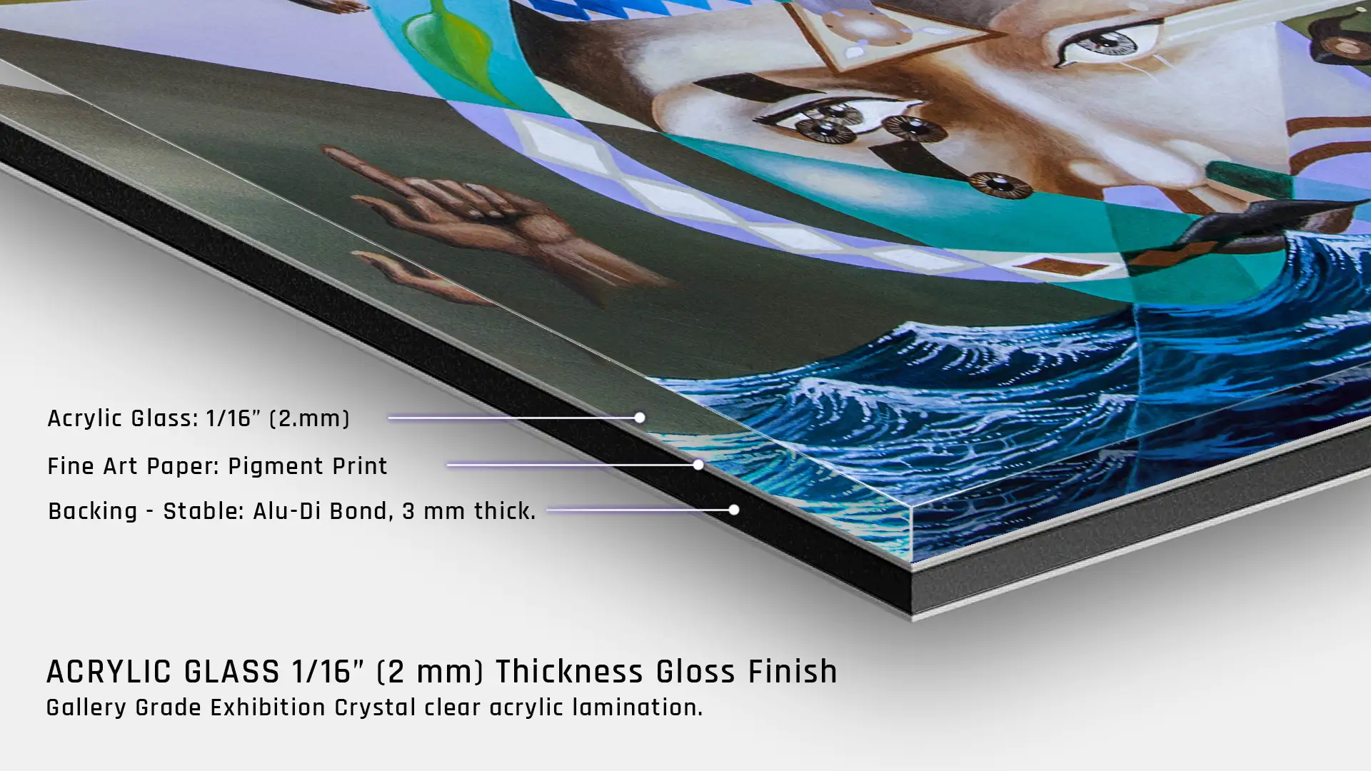 Giclée Fine Art Prints available on a Fine Art Paper Aluminum Dibond Substrate or sealed with a 1/6″ Matt Finish Acrylic Silicone Glass for maximum protection Framed with solid Maple or Oak Floated Frames. Art work comes in 6 different sizes, 3 different frames widths/depths, made with the best Gallery-grade museum quality materials.